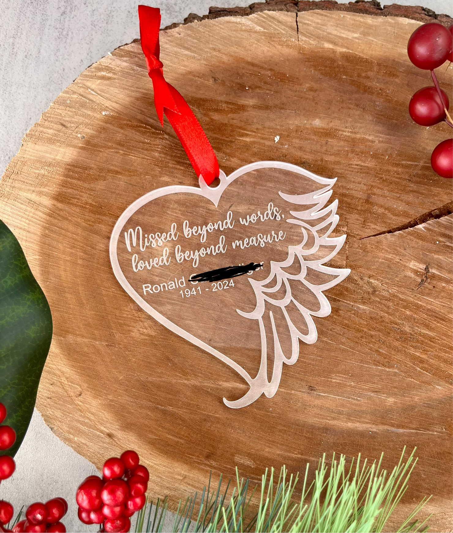 This memorial ornament serves as a beautiful tribute to loved ones. Keep their memory alive with this heartfelt piece, perfect for any holiday season. Made with high-quality clear acrylic, this ornament is a lasting reminder of cherished memories.