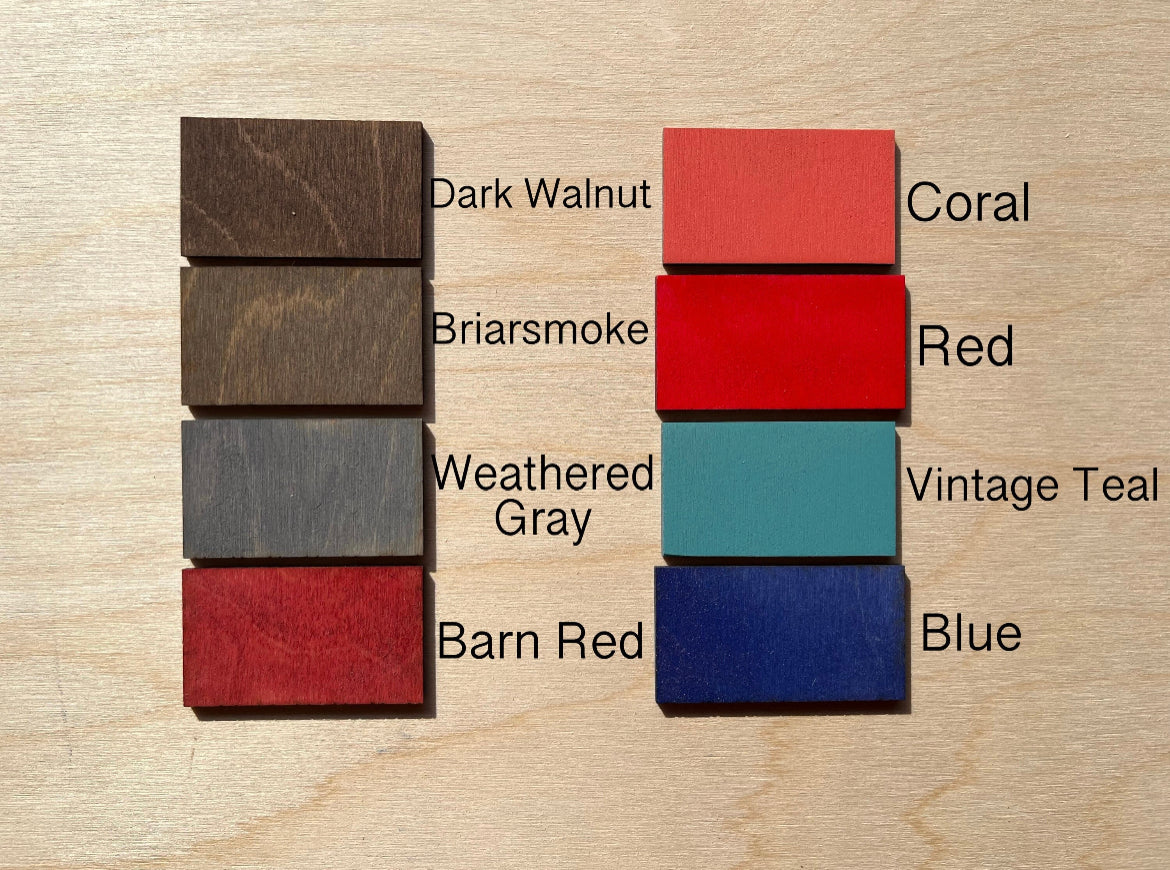 This is natural wood. Colors, wood grains, and overall appearance will vary. Item may smell like burned wood from being enclosed during shipping, but will reside after airing out.